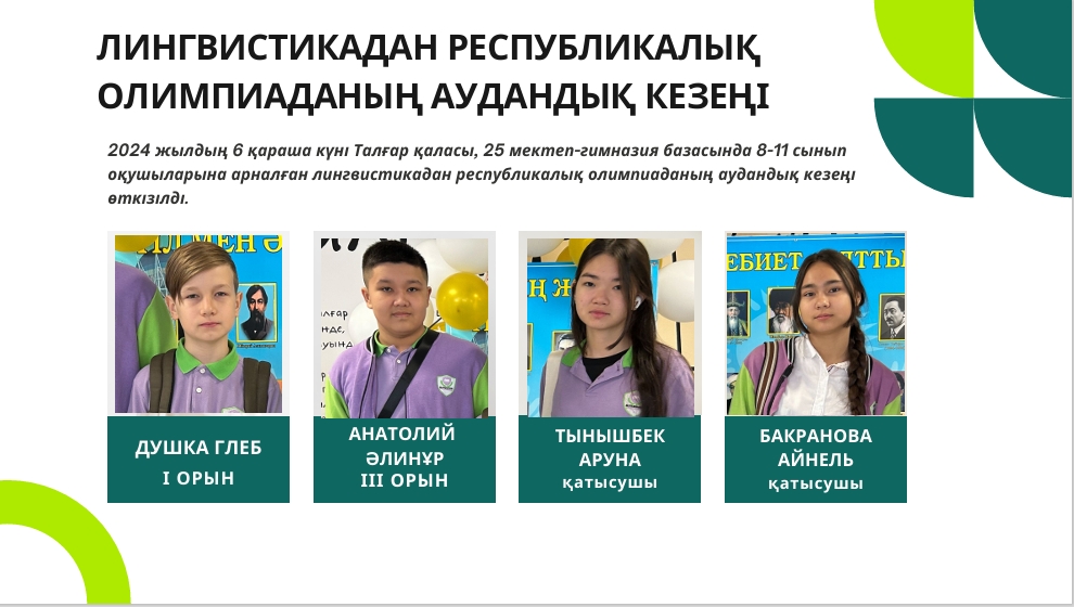 On November 6, 2024, the district stage of the Republican Linguistics Olympiad was held at School No. 25 in the city of Talgar.